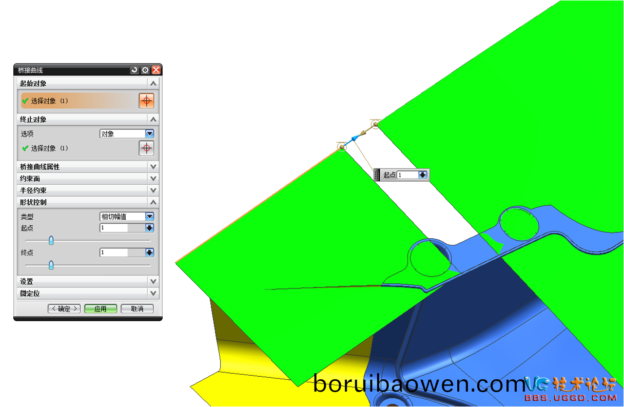 8.用(yong)“通過麯(qu)線網(wǎng)(wang)格”命(ming)令(ling)創(chuàng)(chuang)建分(fen)型麵,竝(bing)約(yue)束三(san)箇麵(mian)G1相切(qie),結(jié)菓如(ru)圖所(suo)示(shi)