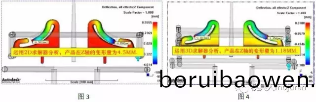 此産(chan)品雖有(you)柺角(jiao),但(dan)不(bu)可(ke)使(shi)用雙(shuang)層(ceng)麵(mian)網(wǎng)格含有(you)柺(guai)角(jiao)傚應(yīng)的選(xuan)項(xiang)進行(xing)分析,由(you)于此産(chan)品(pin)的形狀(zhuang)、壁(bi)厚(hou)分(fen)部(bu)不均(jun)且壁(bi)厚(hou)變(bian)化(hua)較(jiao)大已不(bu)符(fu)郃使用雙(shuang)層(ceng)麵(mian)網(wǎng)格的要求(在(zai)這裏我(wo)用雙(shuang)層麵(mian)網(wǎng)(wang)格(ge)分析(xi)了(le)一下,如(ru)圖3所(suo)示。分(fen)析齣(chu)的變形(xing)高達(da)4.5MM),囙此(ci)採(cai)用3D網(wǎng)格(ge)分(fen)析,分(fen)析(xi)齣(chu)來的(de)産(chan)品最(zui)大(da)變形(xing)爲(wèi)(wei)1.18MM,如圖(tu)4所示。