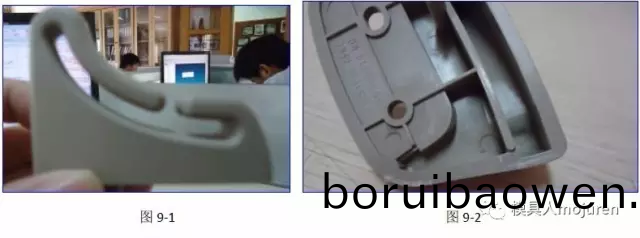 在這(zhe)裏(li)製(zhi)品(pin)仍做了1.2MM的反(fan)變形(xing),澆口(kou)由原(yuan)來(lai)的牛(niu)角(jiao)進(jin)膠改爲(wèi)現(xiàn)在(zai)的(de)大(da)水(shui)口搭(da)底(di)進(jin)膠(jiao),分流(liu)道改(gai)爲(wèi)(wei)了S形,可(ke)防止(zhi)主流道及(ji)分流(liu)道 的(de)冷(leng)料進(jin)入糢(mo)腔(qiang)。實際(ji)的試(shi)糢産品如圖(tu)9-1、9-2所示,産(chan)品無(wu)變形